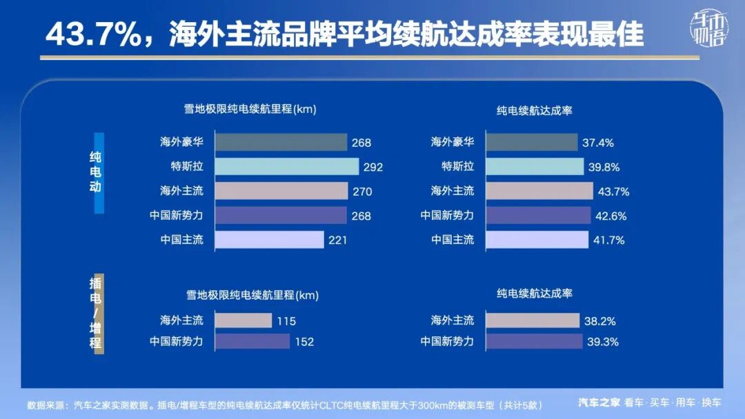 续航方面,分品牌类型来看海外主流品牌纯电车型平均纯电续航达成率43.7%,高于其他阵营。