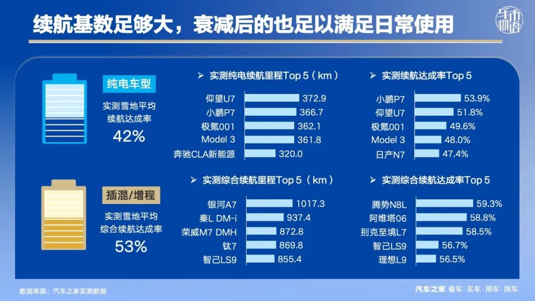 不过,由今年的测试结果来看,插电/增程车型的平均综合续航达成率超过52%,纯电车型为42%,差距并不是非常大。