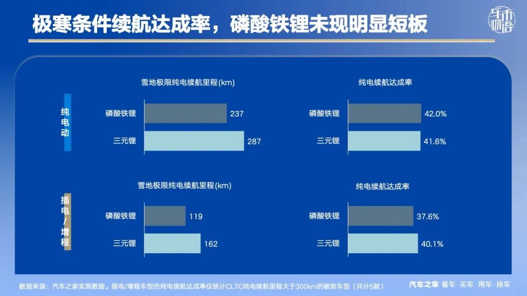 由此次冬测数据来看,纯电动车型中,搭载磷酸铁锂和三元锂电池的车型纯电续航达成率表现相差无几,搭载磷酸铁锂电池的车型平均纯电续航达成率为42.0%,三元锂为41.6%;插电/增程车型中,三元锂的优势略微突出,平均纯电续航达成率为40.1%,磷酸铁锂为37.6%。在“怕冷”“续航短”方面,此次磷酸铁锂并没有显示出明显的劣势,是一大进步。