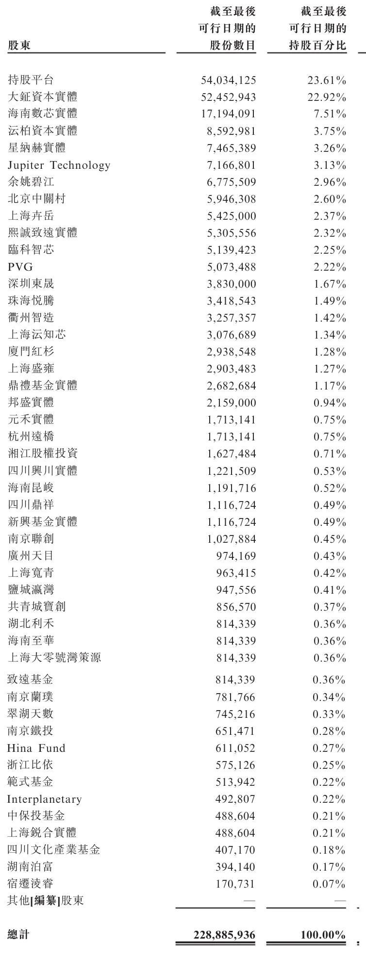 沄柏资本实体持股为3.75%,星纳赫实体持股为3.26%,Jupiter Technology持股为3.13%,余姚碧江持股为2.96%,北京中关村持股为2.6%,上海卉岳持股为2.37%,熙诚致远实体持股为2.32%,临科智芯持股为2.25%,PVG持股为2.22%,深圳东晟持股为1.67%;