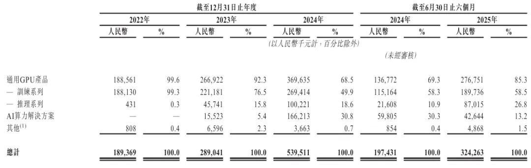 天数智芯2025年上半年来自通用GPU产品收入2.77亿,占比为85.33%,其中,来自训练系列收入占比为58.5%,来自推理系列收入为8702万元,占比为26.8%;来自AI算力解决方案收入为4264万元,占比为13.2%。