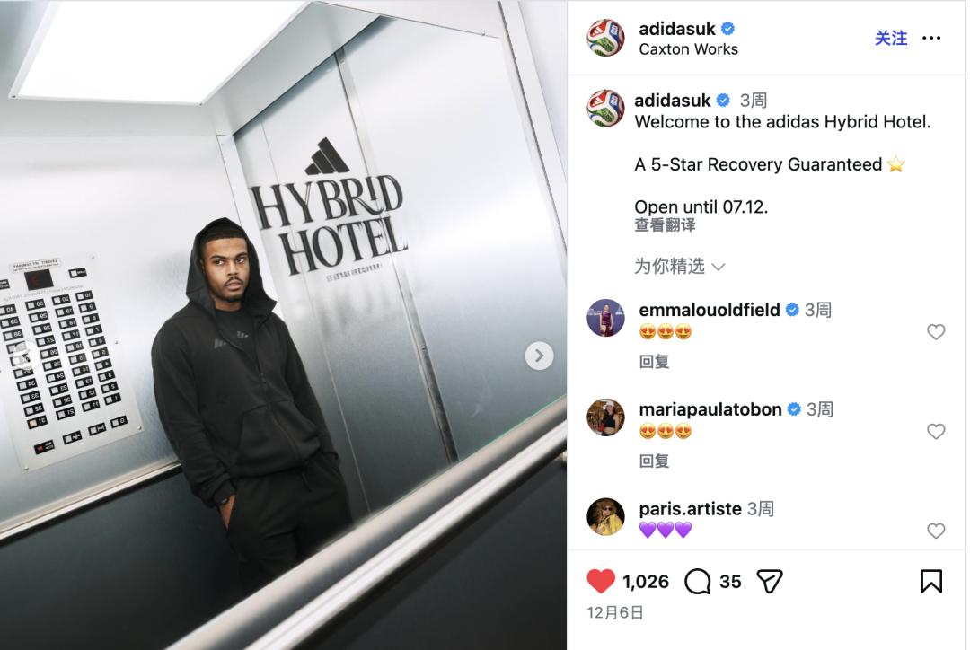 过去两年里,adidas 在伦敦赛事密集期多次推出名为 Hybrid Hotel 的快闪空间。今年 12 月,adidas UK 官方账号再次确认该空间开放至 12 月 7 日。尽管名字里有Hotel,它并不提供住宿,而是在伦敦赛事密集期,面向参与多项高强度竞技活动的运动员开放的恢复与支持空间。