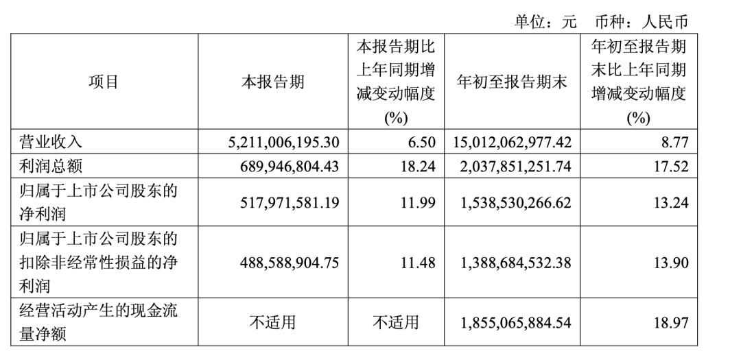 今年前三季度,公司营业总收入150.12亿元,同比增长8.77%,其中第三季度单季营收52.11亿元,同比增长6.5%。归母净利润15.39亿元,同比增长13.24%;扣非净利润13.89亿元,同比增长13.9%。经营活动现金流净额18.55亿元,同比增长18.97%。