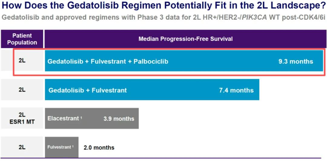 Gedatolisib针对的是“CDK4/6抑制剂耐药的ER+/HER2-晚期乳腺癌患者”。试验结果显示,药物不仅达到了具有临床意义的无进展生存期(PFS)改善终点,更创下了该适应症领域有史以来最佳的中位无进展生存期(mPFS)数据。这也意味着,Celcuity成功补上了乳腺癌核心治疗战场中,长期存在的二线治疗空白。