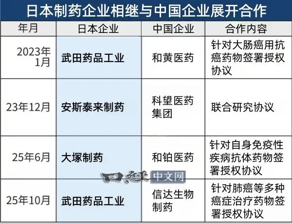 武田药品工业于2023年与中国企业签订了抗癌药的授权协议,2025年10月宣布从中国生物企业以12亿美元首付款获得抗癌药。武田社长兼CEO克里斯托夫·韦伯(Christophe Weber)指出,“在中国开展研发具有优势,比如临床试验中受试者招募更迅速、成本方面也更具竞争力”。
