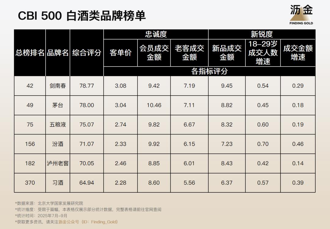 从CBI的榜单指数也能看出来,新锐度指标中18-29岁成交人数增速,汾酒0.70的评分排名最高,剑南春在新锐度的新品指标是传统高端白酒中最高的,年轻人群增速也名列前茅。