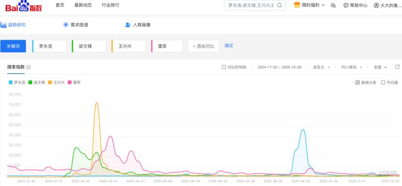 百度指数显示,罗永浩年内最高热度为47000,远超李佳琦和董宇辉。实际上,2025年,各路风流人物尽数登场,前有梁文锋和王兴兴,后有雷军,罗永浩的最高热度仅次于王兴兴,却超过了梁文锋和雷军。