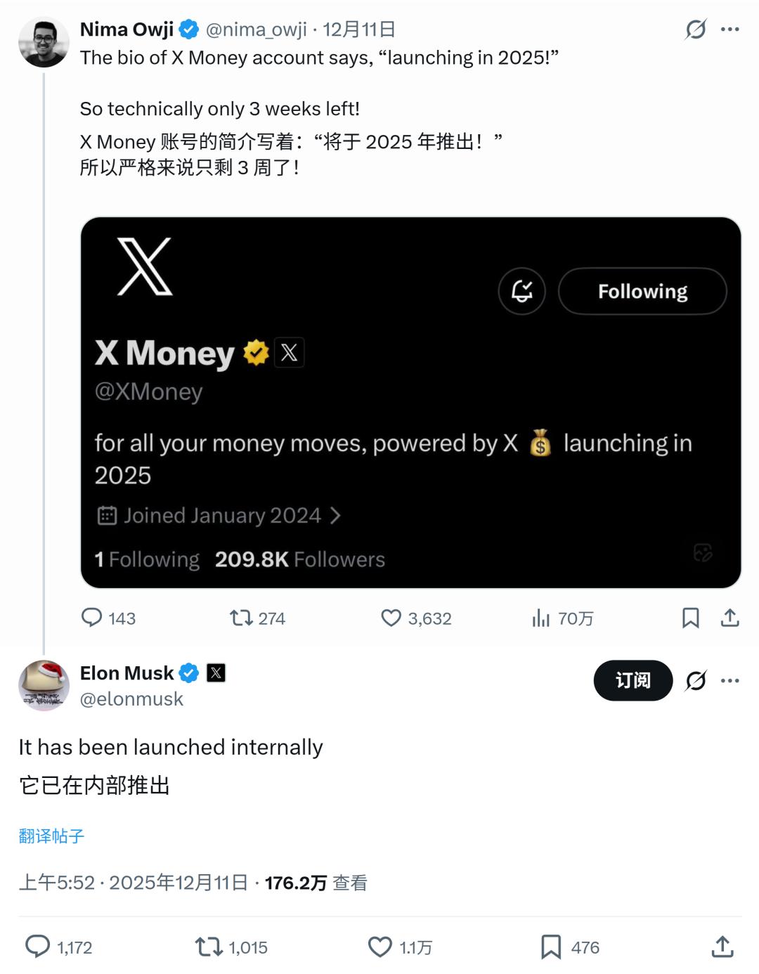 12 月,马斯克简短更新了 X Money 的进展,在一条帖子中称其「已在内部启动」,但未透露具体的公众开放时间。