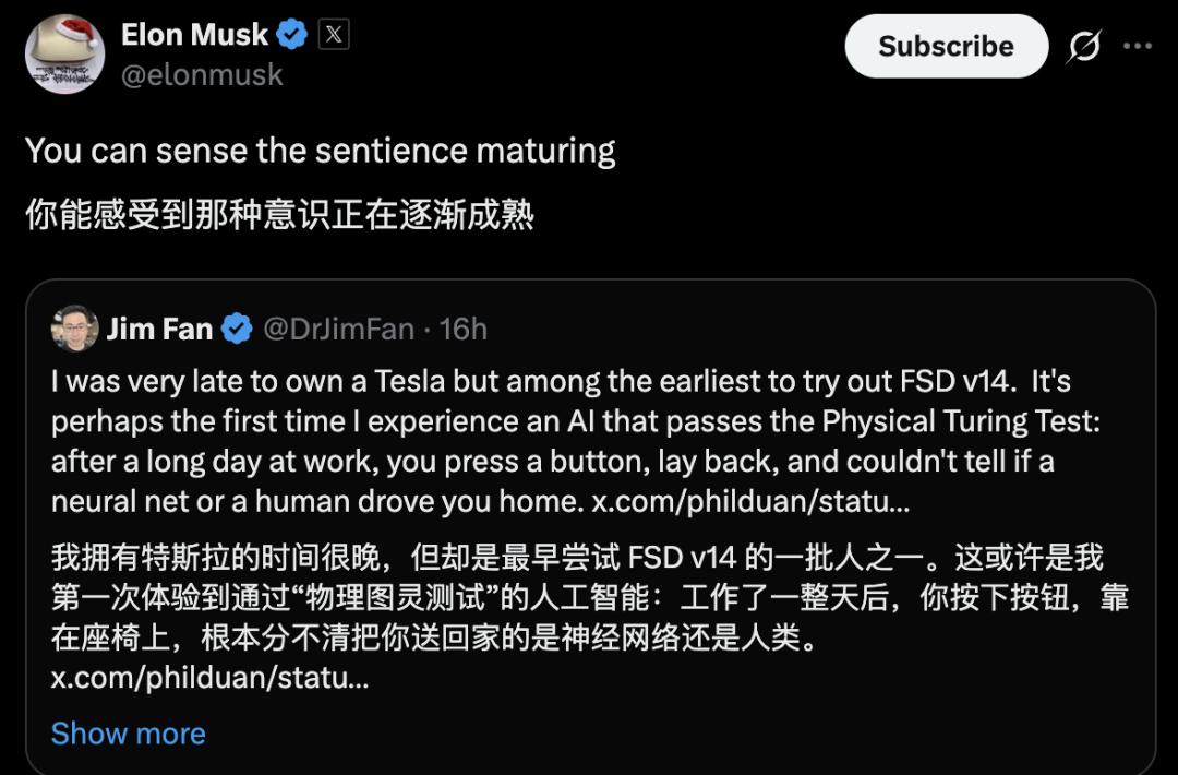 马斯克宣称FSD v14意识觉醒,英伟达总监亲测