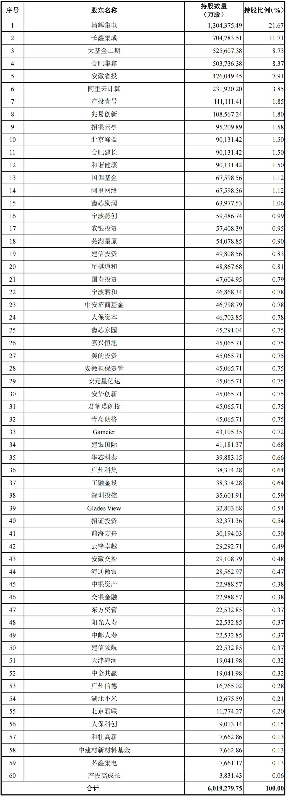 清辉集电、长鑫集成、大基金二期、合肥集鑫、安徽省投的直接持股比例均超过5%,分别持有长鑫科技21.67%、11.71%、8.73%、8.37%、7.91%的股权。
