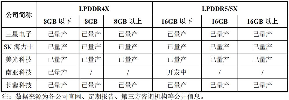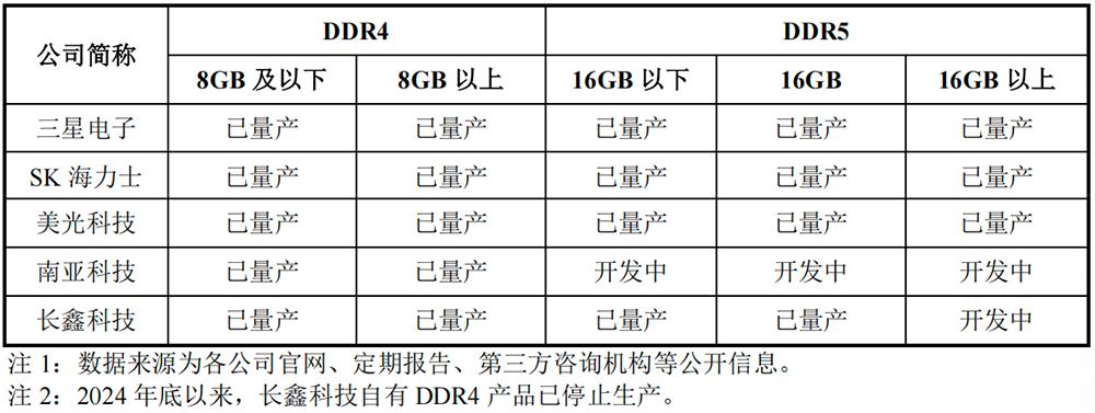 截至2025年6月30日,长鑫科技与同行业企业产品对比情况如下: