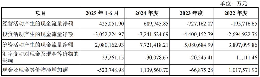报告期内,长鑫科技经营活动产生的现金流量净额分别为-19.57亿元、-72.72亿元、68.97亿元、42.51亿元;各期末现金及现金等价物余额分别为317.81亿元,311.13亿元、425.08亿元、372.71亿元。