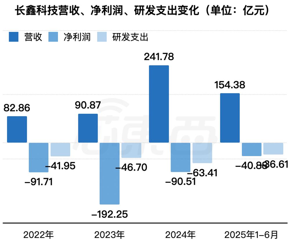 2022年、2023年、2024年、2025年1-6月,长鑫科技营收分别为82.86亿元、90.87亿元、241.78亿元、154.38亿元,净利润分别为-91.71亿元、-192.25亿元、-90.51亿元、-40.88亿元,研发费用分别为41.95亿元、46.70亿元、63.41亿元、36.61亿元。