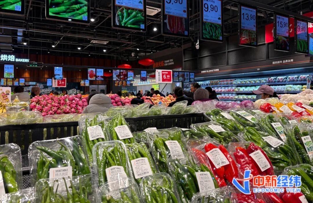 12月30日,中新经纬在前述连锁超市内看到,茄子6.99元/斤,白菜0.99元/斤,螺丝椒9.9元/斤,杭椒约16.48元/斤。而超市里猪肉(冷鲜后腿肉)的价格为6.99元/斤。