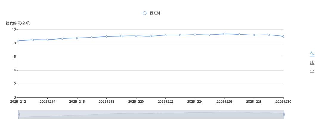 近几日,西红柿价格有所松动。据农业农村部数据,12月26日,西红柿全国批发市场的平均中间价曾一度涨至9.33元/公斤,截至12月30日降至8.96元/公斤,但较10月31日的6.56元/公斤涨幅仍达36.59%。