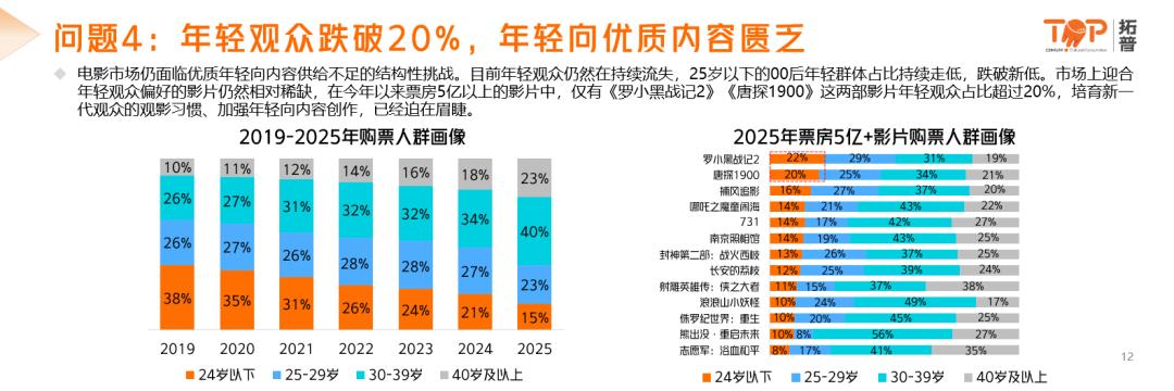 根据11月份拓普数据《2025年中国电影市场洞察》显示,2019年到2025年购票人群画像,24岁以下观众从38%跌至15%。年轻观众抛弃电影有两点原因,一是没有可看的,内容上对年轻观众吸引力不足。二是营销上吸引不了年轻观众,所谓的营销物料变成了“信息垃圾”。