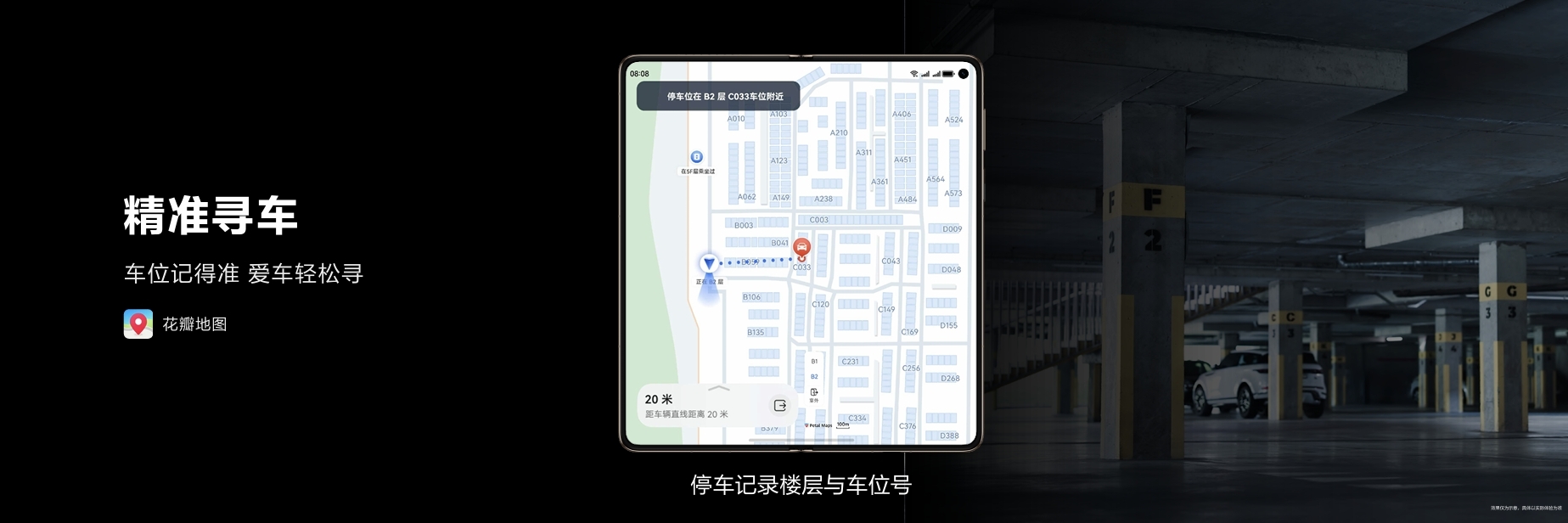 除“户外探索”模式外,花瓣地图针对出行常见困扰迭代实用功能,让每段行程更高效舒心,华为Mate 80系列与Mate X7折叠屏上全新上线“精准寻车”功能,实现停车自动记录、跨楼层精准定位寻车,轻松化解“停车易,找车难”的尴尬。同时为华为Mate X7折叠屏量身定制「分屏导航」模式,充分发挥大屏优势,支持导航与其它应用并行操作,在小红书刷到一家网红景点,不必复制地址、切换地图——直接分屏唤起小艺,路线规划实时同步花瓣地图,一气呵成带来流畅便捷的多任务出行体验。