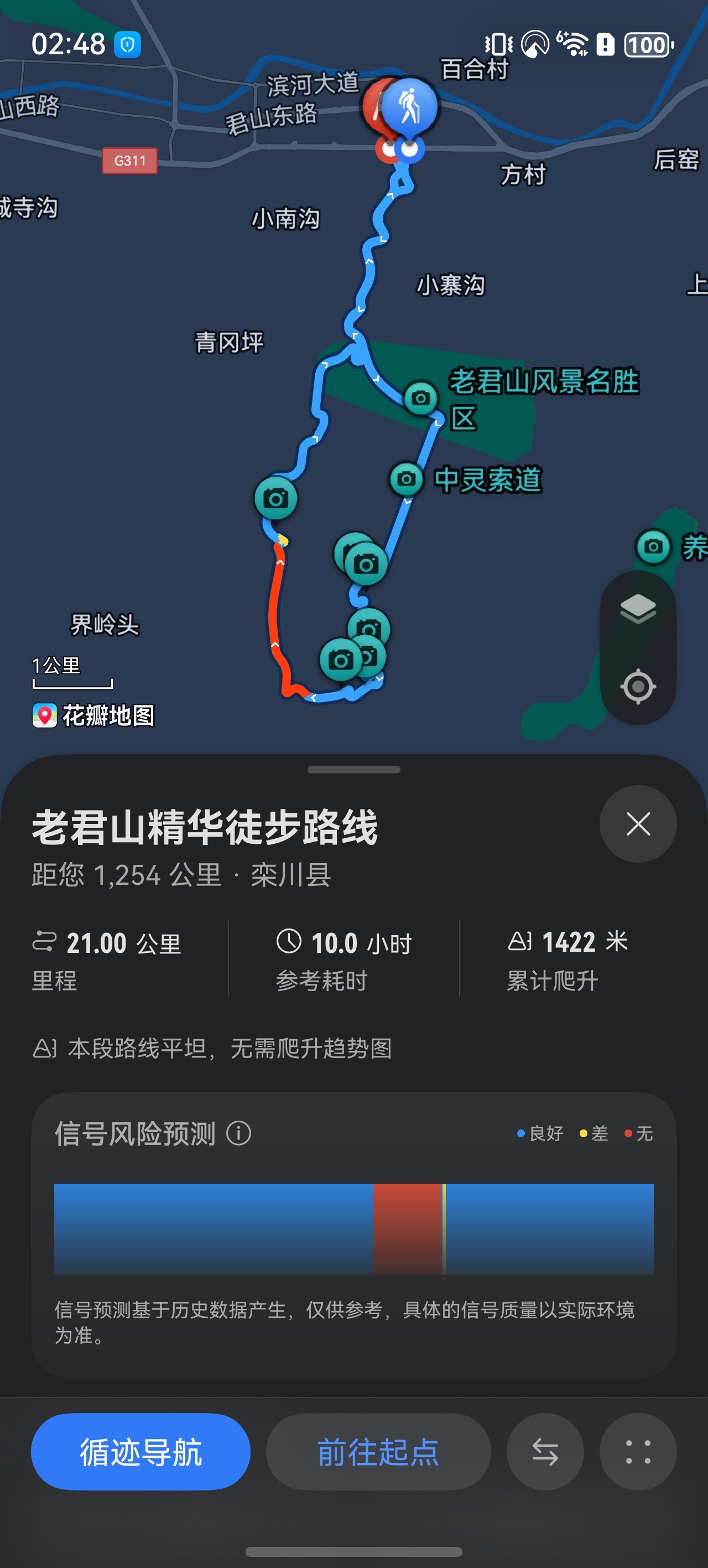 行进过程中,路线偏航和信号盲区风险,是探索者在长距离穿越过程中的核心顾虑。花瓣地图“循迹导航”通过智能提醒全程护航,当路线偏航、距里程碑达到整数公里、进入无信号区域等关键节点,系统将自动触发语音播报,帮助用户实时掌握行程动态,规避迷路风险。配合业界首发信号地图功能,通过不同颜色直观标注“信号良好/较差/无信号”区域,让信号盲区“可视化”,方便用户预判应对。若需折返,用户还可随时通过“原路返回”功能,调取最近14天的轨迹记录,从任意历史轨迹点启动返航,确保探索进退从容、全程可控。