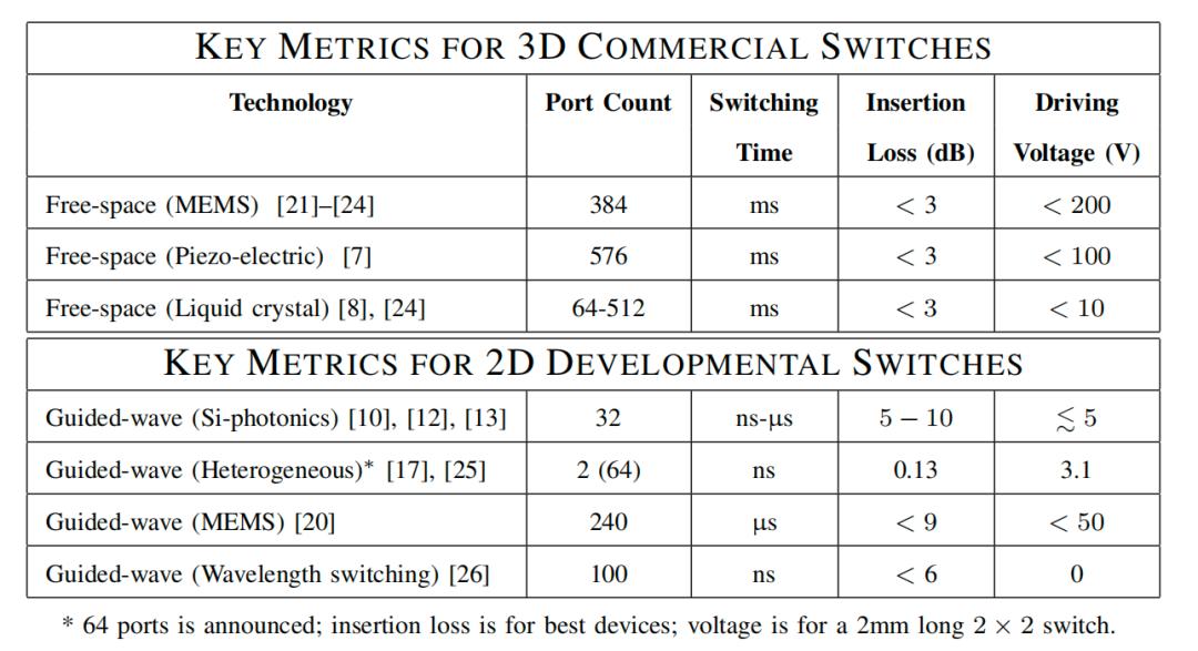 表 I:商用及研发型光电路交换机(OCS)的关键性能指标。