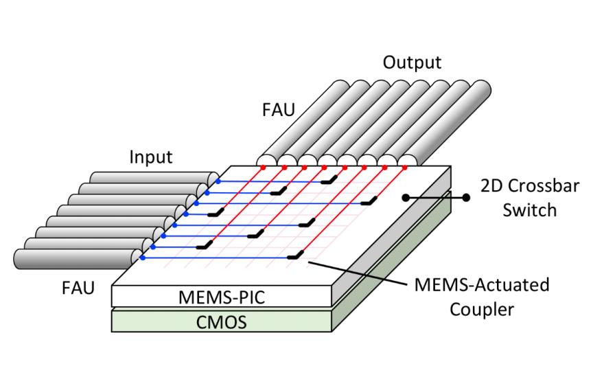 3)硅光子 MEMS 器件:MEMS 器件也可用于硅光子二维交换机。图 3 展示了该器件的布局结构。输入与输出光纤阵列单元(FAU)连接到一个由波导构成的二维交叉矩阵结构上。在每一个波导交叉点处,采用 MEMS 驱动的耦合器,将光引导至两个方向之一。随后,该 MEMS 光子集成电路(PIC)与一个控制 CMOS 芯片进行集成。