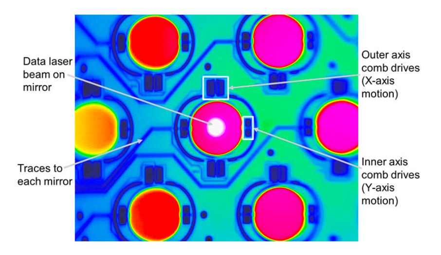 图 1: 带反射镜的 MEMS 执行器细节图(伪彩色显示),以及用于绕两个轴产生旋转的四个梳齿驱动器。