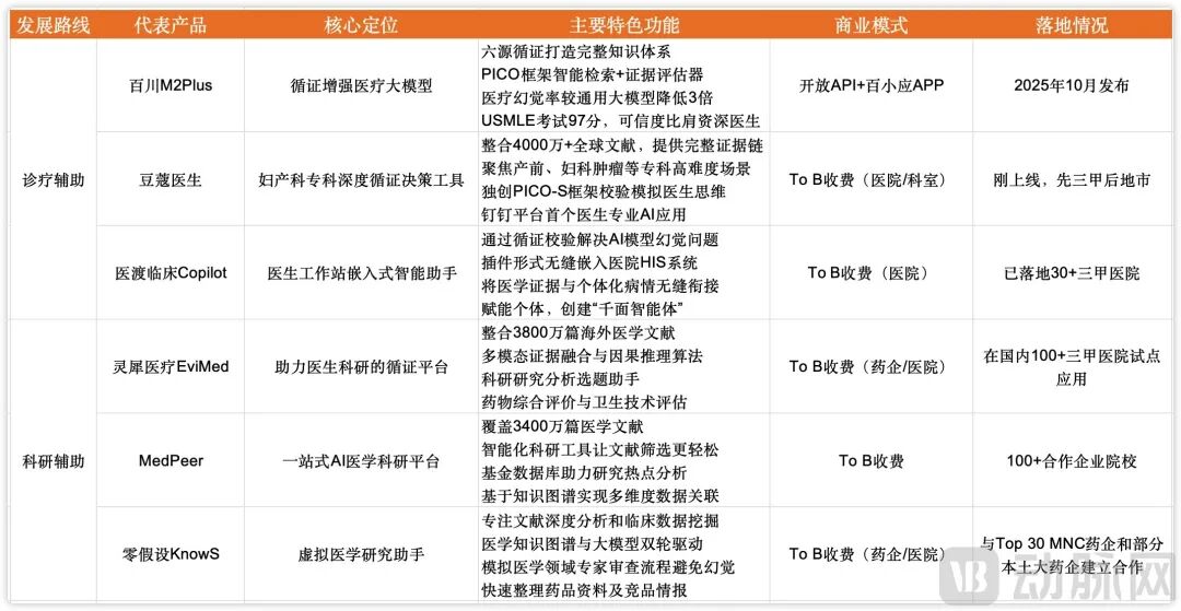 总的来看,面对OpenEvidence以免费模式+广告收入验证的医疗AI商业模式,中国创新力量并未简单复制,而是基于本土医疗体系特点,特别是基于B端主导的付费逻辑,在诊疗辅助与科研辅助两条路径上形成了场景化深耕、专科化突破、生态化协同的集体破局模式。