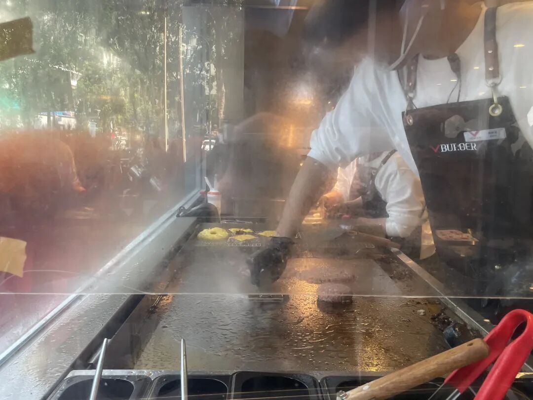 除了现烤汉堡胚,必胜汉堡还通过开放式厨房,将肉饼制作、现场分切菠萝片等全过程呈现给消费者。像新闻路店就专门将铁板对准街道,路人可以透过玻璃,直观看到肉饼、菠萝片等在高温铁板上滋滋作响。