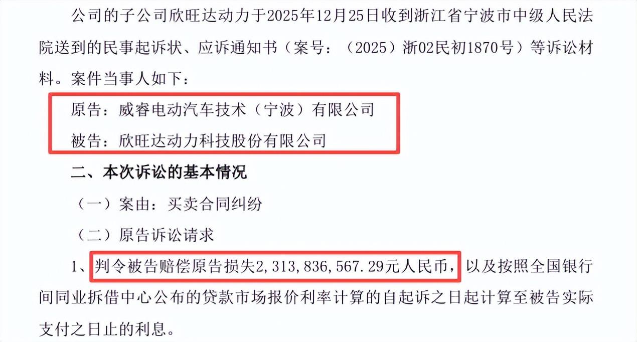 2025年12月末,新能源汽车行业正酝酿着新年的产销冲刺,资本市场却突然被一则重磅公告掀起波澜。吉利旗下核心动力电池集成企业威睿电动汽车技术有限公司(下称“威睿”),正式起诉长期合作的电池供应商欣旺达动力科技(下称“欣旺达动力”),索赔金额高达23.14亿元人民币。