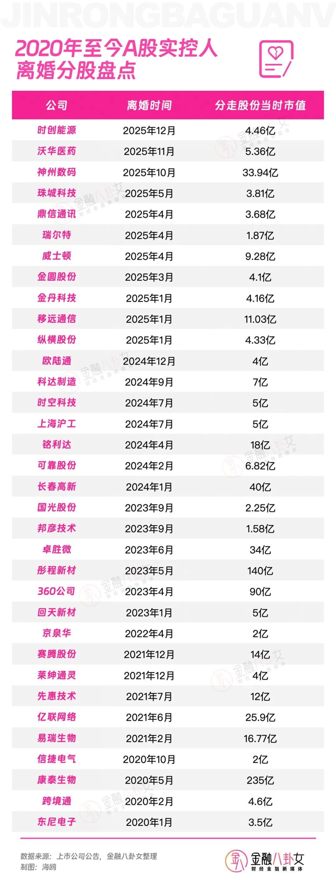 从2020年至今,A股的实控人天价离婚已经有34起,实控人老婆们合计分走了764.44亿。