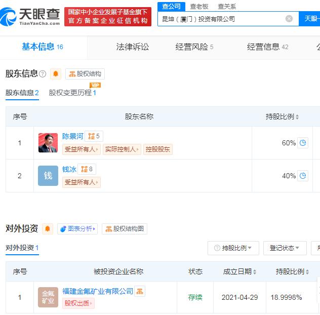 不过,其中有两家公司,福建金氟矿业和昆坤(厦门)投资有限公司,是钱冰和陈景河在婚后合伙开的。