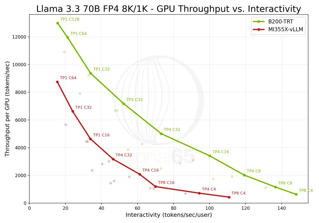 再来看,当交互性提升至110 tokens/sec/user时,这一优势进一步被放大:B200吞吐量超过MI355X的6倍。