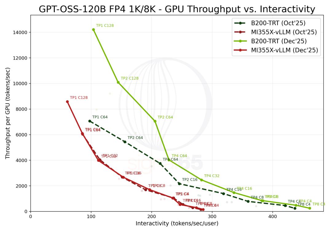 得益于软件优化,两边平台的绝对性能都明显提升:英伟达单GPU峰值吞吐从大约7,000 tokens/sec提升到超过14,000;AMD也从约6,000提升到大约8,500。