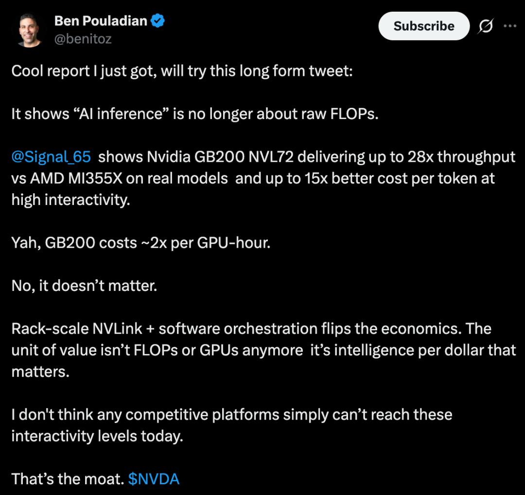 Signal65一份最新报告中,英伟达GB200 NVL72是AMD MI350X吞吐量28倍。