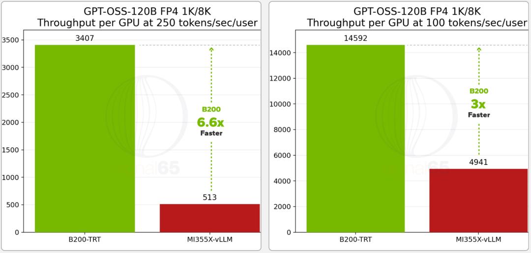 在10月下旬数据里,当目标是100 tokens/sec/user时,B200大约比MI355X快1.4倍;