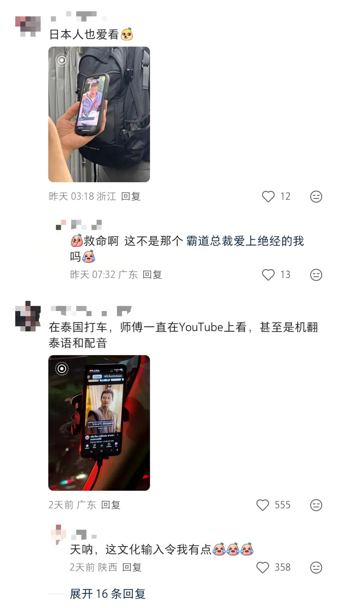 在评论区,网友就“短剧出海”纷纷展开讨论,有网友称“日本人也爱看”,并附上观看日语短剧图片一张;也有网友称在泰国打车时,司机一直在观看机翻泰语和配音的中国短剧。