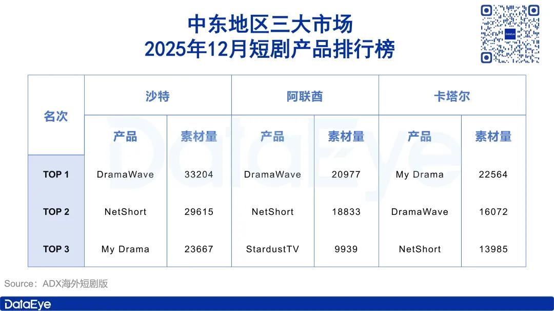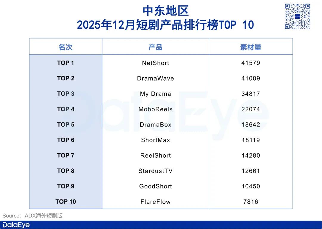 在产品方面,ADX海外短剧版数据显示,中东地区主要市场(沙特、阿联酋、卡塔尔、阿曼、科威特、巴林、以色列)2025年12月累计投放素材量31.4万组。