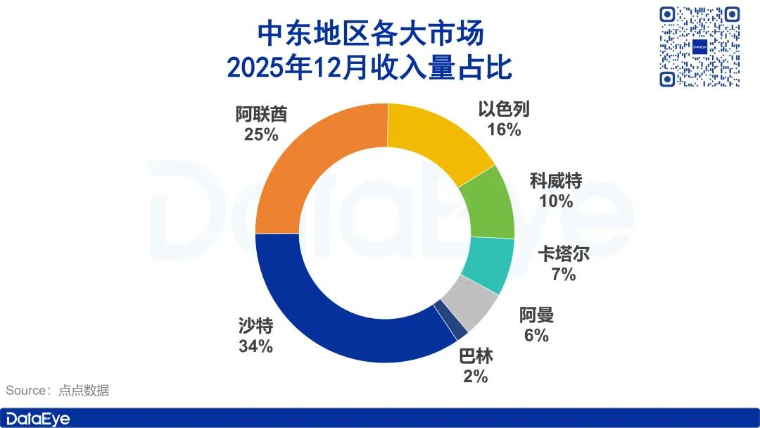 收入量方面,沙特依旧位列第一,达73.1万美元,占比34%;阿联酋和以色列紧随其后,收入量分别为54.3万美元和33.5万美元。