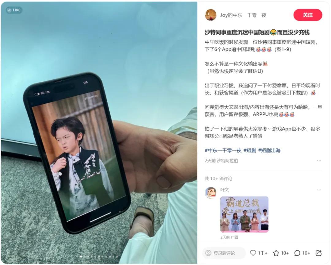 就在前两天,DataEye短剧出海才发现一条“沙特老哥沉迷中国短剧”的帖子在小红书爆火,点赞量超3000个,评论量超700条。