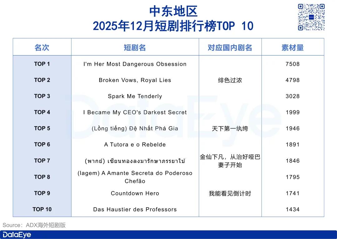 在剧集方面,ADX海外短剧版数据显示,中东地区主要市场2025年12月主投短剧TOP 3分别为《I'm Her Most Dangerous Obsession》《Broken Vows, Royal Lies》和《Spark Me Tenderly》,素材量分别为7508组、4798组和3028组。
