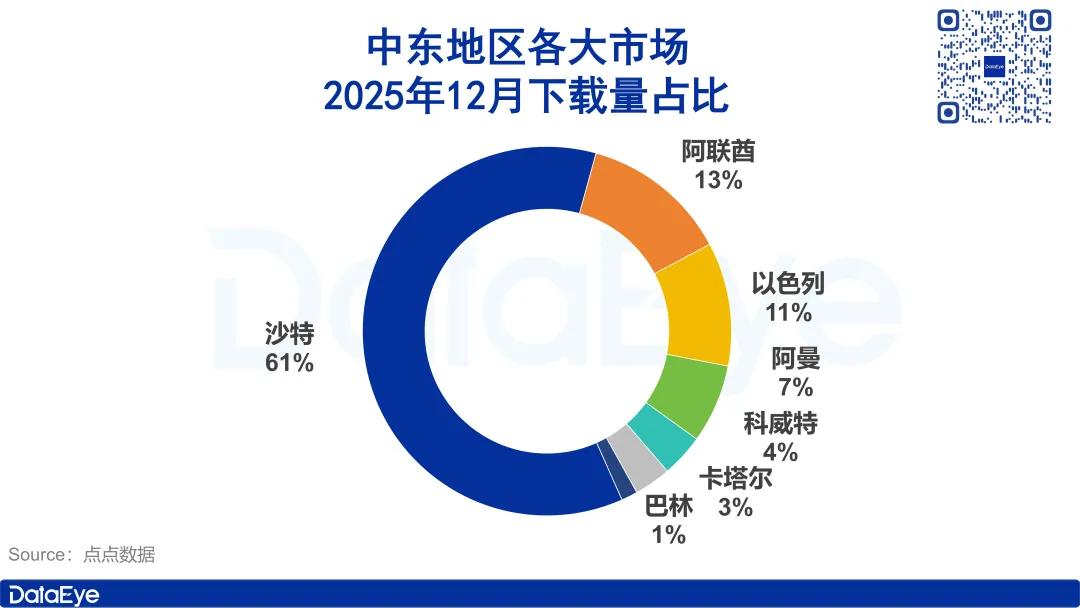 在各细分市场,以上述TOP 10产品为样本,下载量方面,沙特以136.9万次下载量占据了中东地区主要市场的61%,遥遥领先于其它市场。
