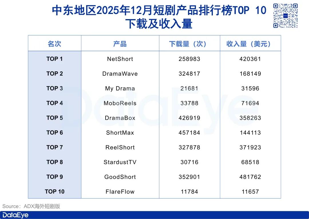在下载和收入量方面,点点数据显示,上述TOP 10产品中2025年12月中东地区主要市场下载量最高的三款产品为ShortMax、DramaBox和GoodShort,下载量分别为45.7万次、42.7万次和35.3万次;收入量最高的产品分别为GoodShort、NetShort和ReelShort,收入量分别为48.2万美元、42.0万美元和37.2万美元。