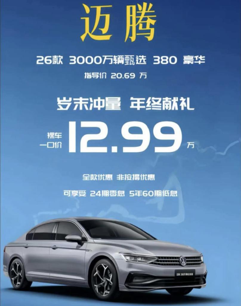 此外,一汽大众迈腾3000万辆甄选380豪华版售价也降至13万级,一口价12.99万元开卖,相较20.69万元的指导价实现了6折卖车。