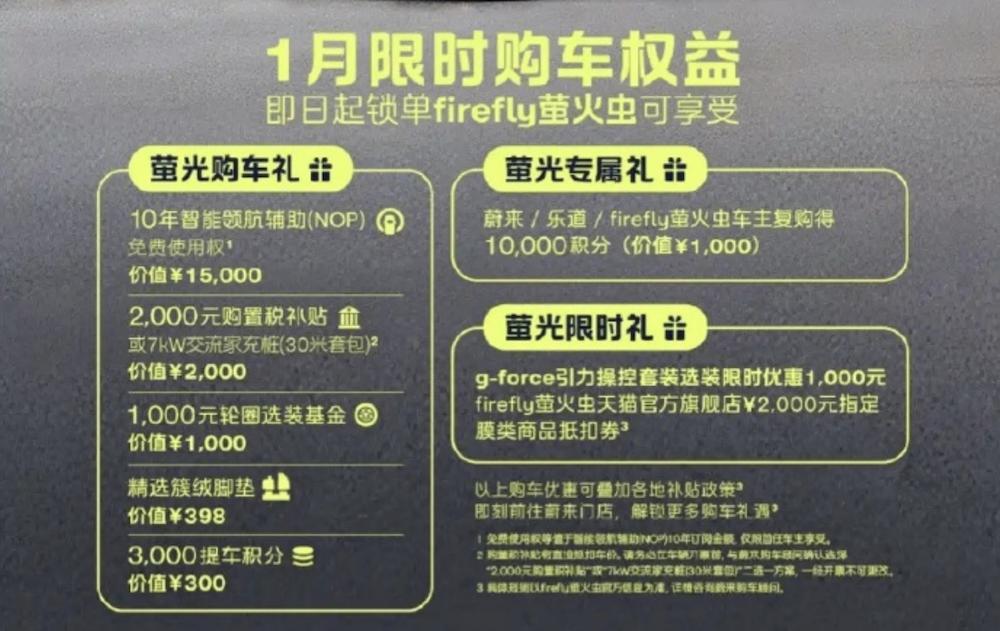 firefly萤火虫也在新年第一天推出1月限时购车权益,直接给锁单用户丰富大礼包,包括10年智能领航辅助、2000元购置税补贴或7kW交流家充桩、1000元轮圈选装基金、精选簇绒脚垫、3000元提车积分等。