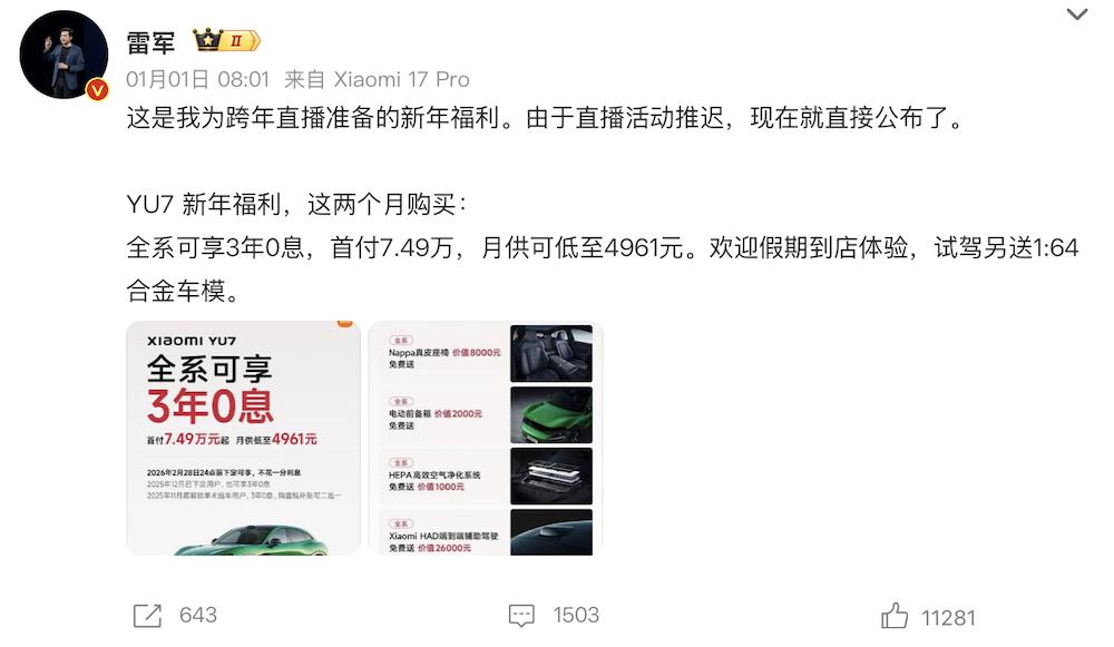 新势力车企层面,雷军日前官宣,为小米YU7推出了新年福利,用户购买全系车型可享3年0息,首付7.49万,月供可低至4961元。