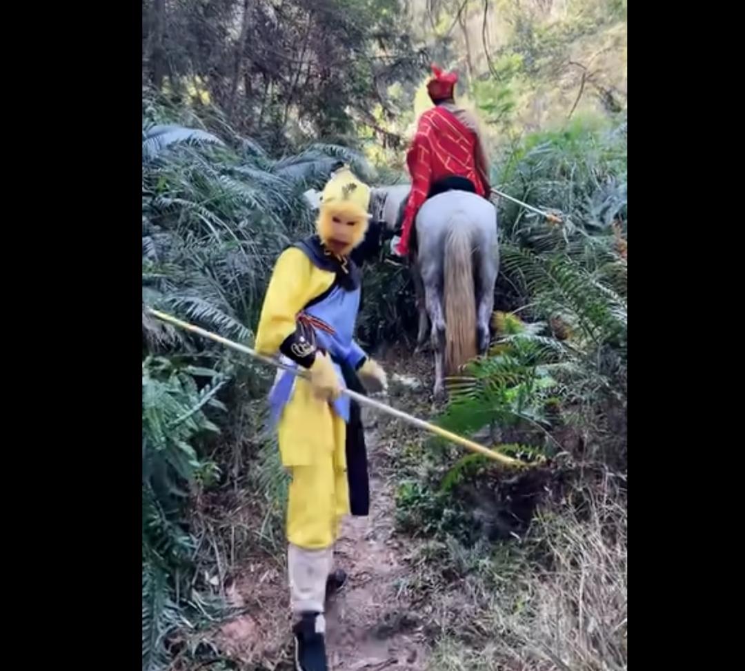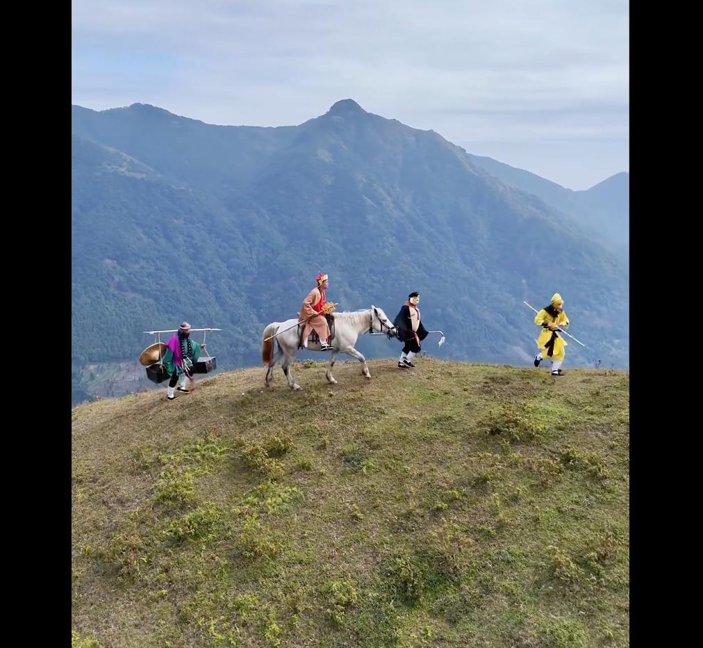 有演员的动作也符合自己的“人设”,孙悟空棍子耍得有模有样,时不时就抓抓耳朵,八戒挺着个大肚子,隔三差五就喊累。而且人家是真的在徒步,一场直播,钻进深山老林里连续走几个小时,从泥巴地走到悬崖边,从山沟沟走到高坡,在齐腰的野草里面开路,给人的感觉就是,仿佛亲临86版《西游》的拍摄现场,再搭配上循环播放的《云宫迅音》和《敢问路在何方》当BGM,观众就很有代入感。
