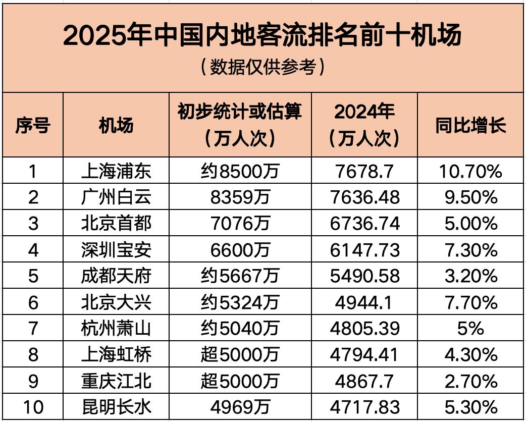根据公开信息,2025年中国(内地)旅客吞吐量前十机场分别是:上海浦东、广州白云、北京首都、深圳宝安、成都天府、北京大兴、杭州萧山、上海虹桥、重庆江北、昆明长水。
