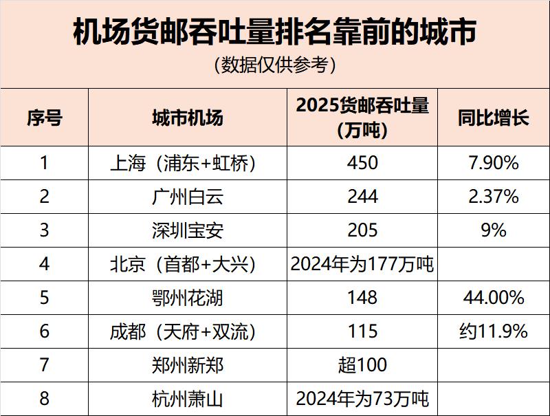 另外两个城市也比较出色,成都、郑州2025年的航空货邮吞吐量也均超过了100万吨。