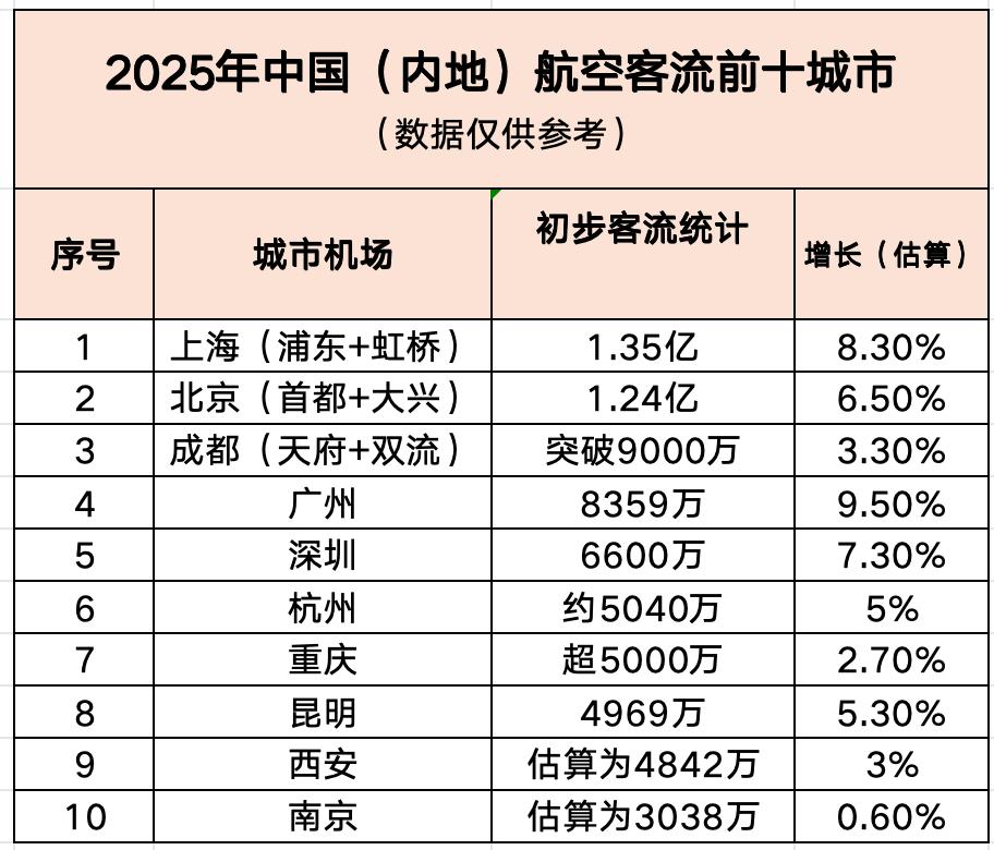 成都排名第三,2025年成都两大机场旅客吞吐量合计超9000万人次,同比增长3.3%。