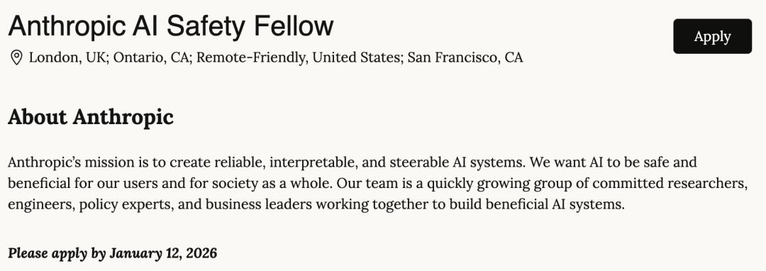 Anthropic提供一个为期4个月的全职研究Fellowship,给出的定位是「加速AI安全研究、培养相关研究人才」,核心目标是让Fellows产出可公开发表的AI Safety研究成果,Anthropic透露过往届 80% 以上的学员最终写出了论文。