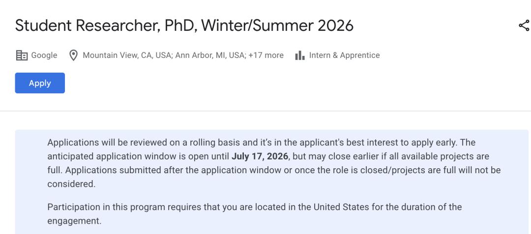 该项目是一个滚动招募的学生研究项目,重点对象是「美国境内的计算机科学及相关领域PhD学生」,能进入Google DeepMind、Google Research等团队,以「项目制」参与具体研究课题。
